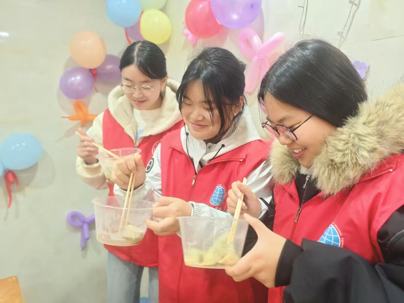 活动前,志愿者提前准备好食材,并用装饰物将现场布置得温馨舒适。活动当天,同学们积极参与,大家分工明确、默契配合,一个个饱满的饺子在大家手中成型,承载着对考研学子的美好祝愿。在活动过程中,梅三宿舍楼里的欢声笑语此起彼伏,更添一抹温暖。每位参与活动的同学都吃到了热气腾腾的饺子,品尝到了这份冬至限定的温暖,驱散了疲惫,增添了动力。