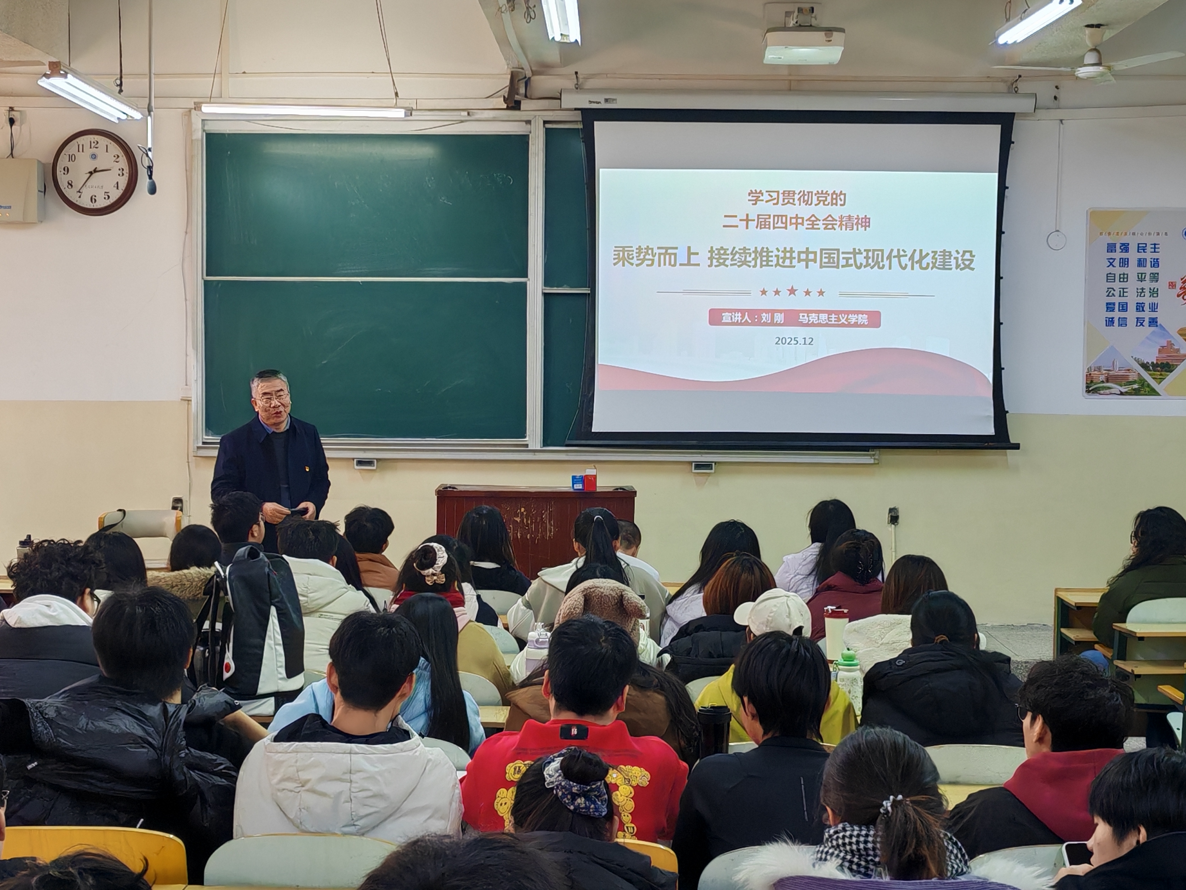 邀请校宣讲团骨干成员刘刚教授给2023级学生举行一场 “乘势而上,接续推进中国式现代化建设”党的二十届四中全会精神报告会,会议由2023级辅导员胡佰林主持。
