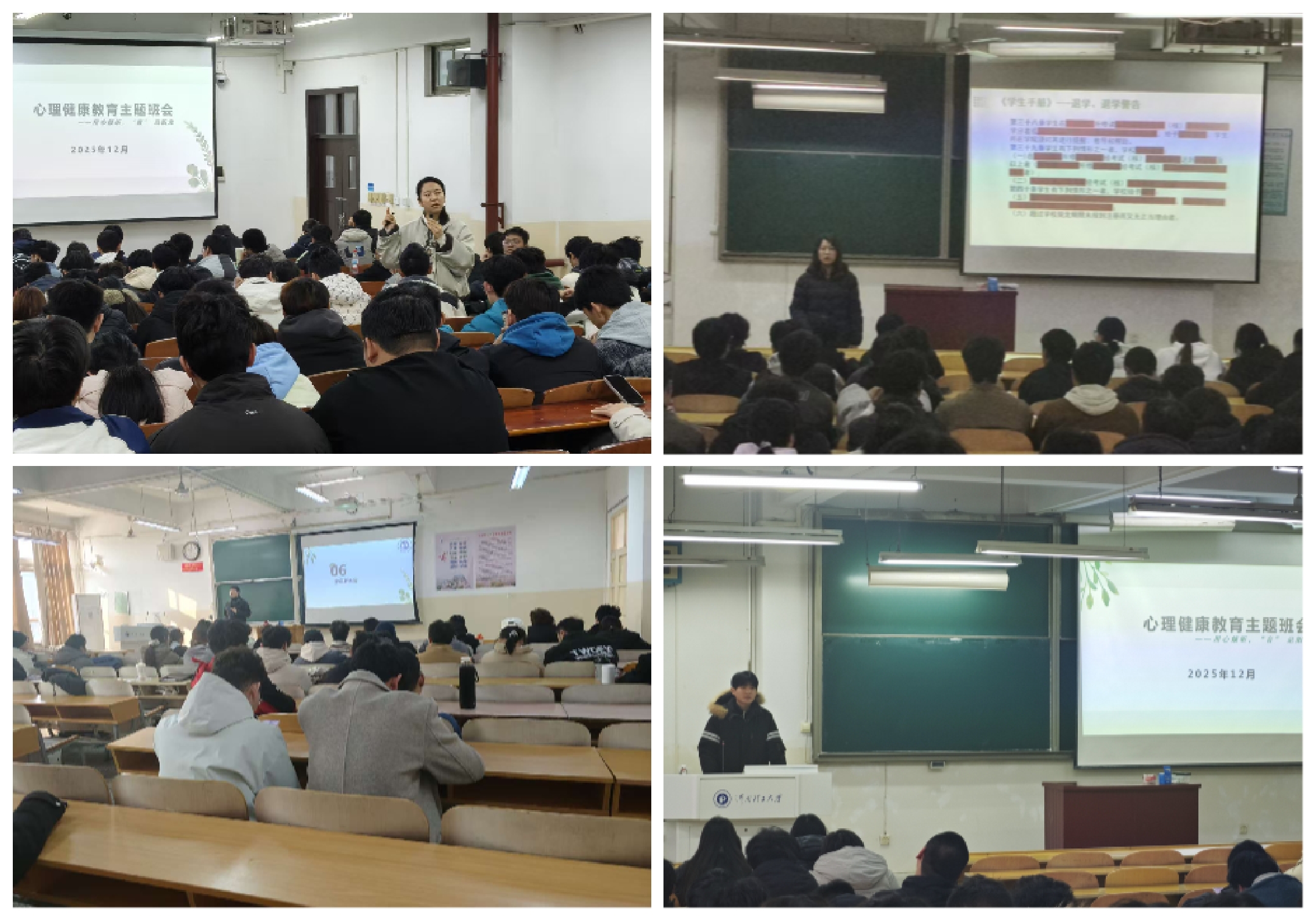 心理健康是学生成长成才的重要基石,更是校园和谐稳定的关键保障。班会期间,辅导员围绕心理健康核心标准、心理危机识别要点、常见心理困扰应对策略及心理咨询资源等四大模块展开讲解。通过理论解读结合典型案例分析,系统介绍了大学生在人际关系、情感交往、学业发展等方面的常见心理问题,引导学生既要关注自身心理状态,也要主动关心身边同学。各年级辅导员重点强调了心理危机的信号特征与科学应对方法,针对新生适应、毕业生择业焦虑等普遍性问题提供了实用的疏导技巧。同时,详细告知学生学校心理健康教育与咨询中心的预约流程、联系电话及定点医院信息,鼓励学生在遇到心理难题时主动寻求专业帮助。